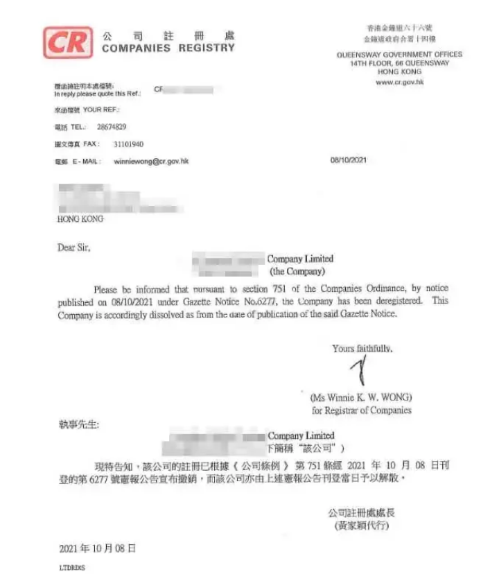 2、当公司接到税务局发出的《不反对注销通知书》后,便可向香港登记处提出注销申请,登记处接获申请后,亦会作进一步核实